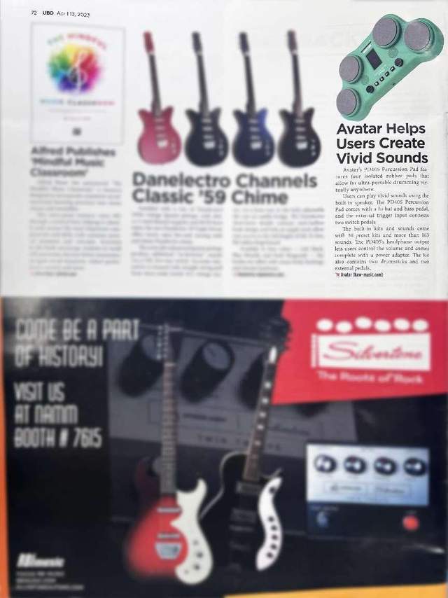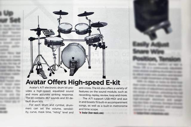 由国际知名的美国音乐展,NAMM SHOW出版的Up Beat展会特刊对海星王avatar在展会上的产品进行了报道,其中,A71电子鼓以及PD405打击板更是得到了众多海外专业音乐爱好者的深度认可。在杂志中,A71电子鼓被称赞为“为音乐爱好者提供极速畅快的击鼓体验”,而PD405则被称赞为“为音乐爱好者创造更为生动逼真的音色”。
